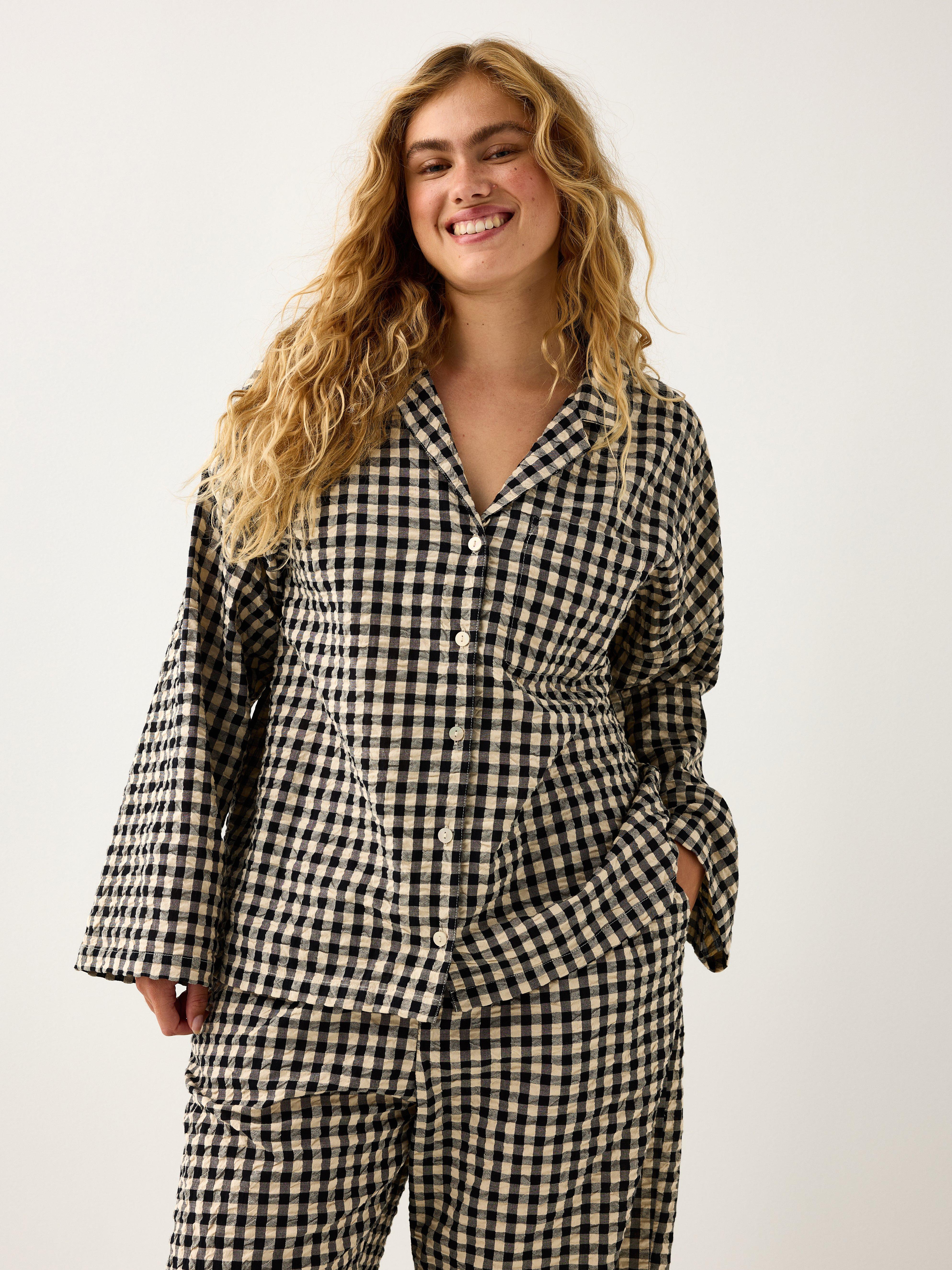 Pyjamapaita, jossa on pitkät hihat ja napit edessä.
